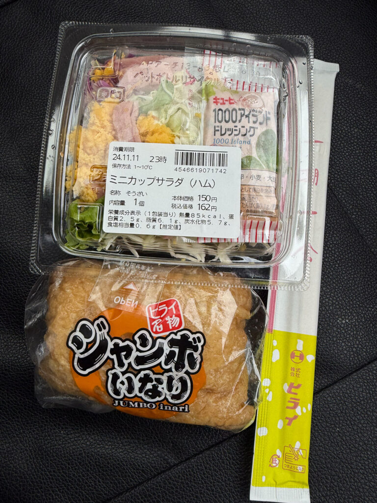 なかなか決められませんでしたが、車内で食べる用のサラダと、走りながら食べらる&ヒライ名物、とあったのでジャンボおいなりさんに決定です。